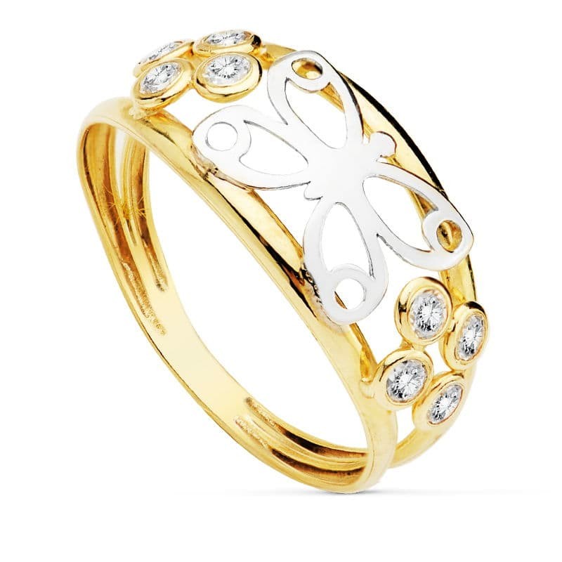 18K SORTIJA OR BICOLOR DOBLE CUERPO MARIPOSA CALADA Y CIRCONITAS....