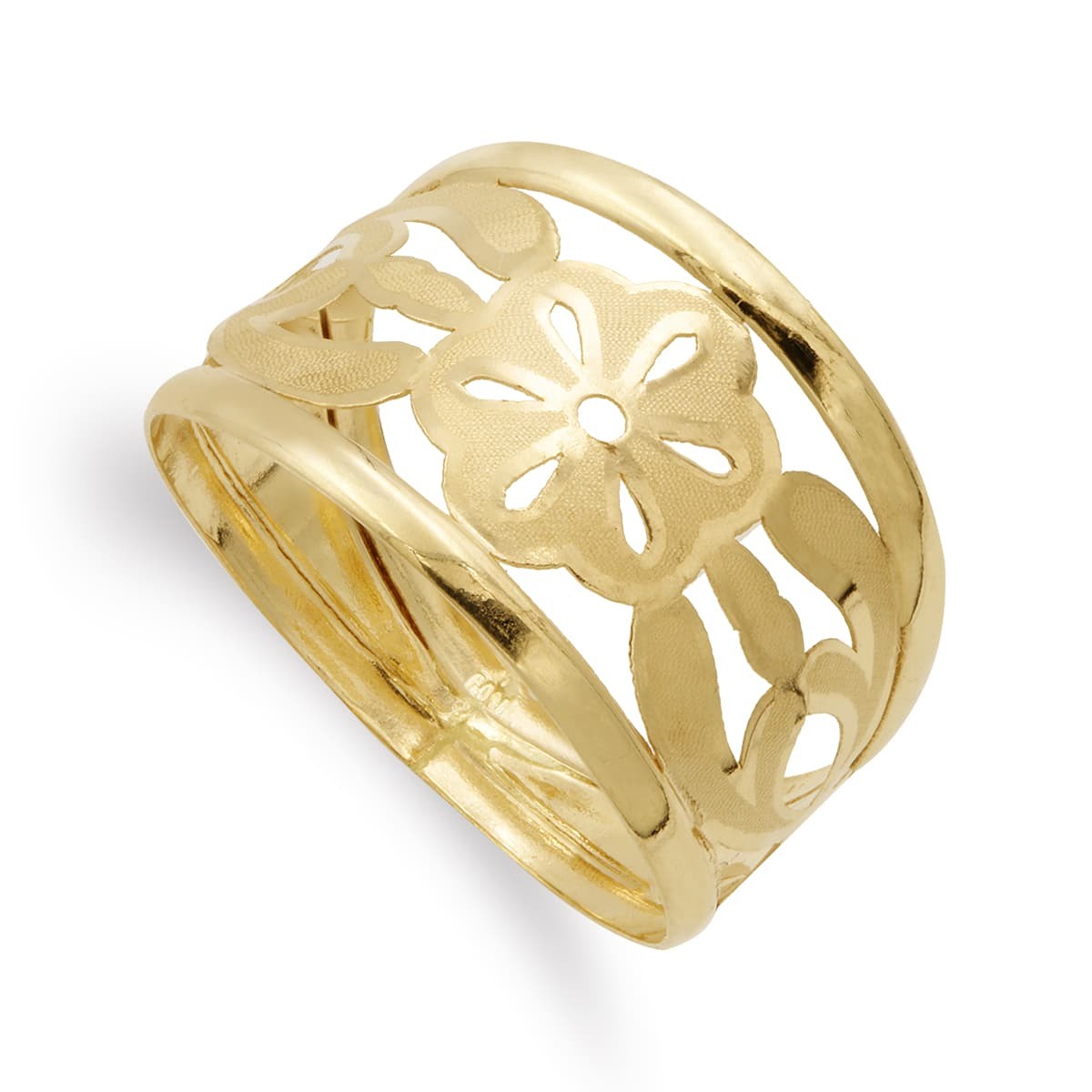 18K SORTIJA ORO AMARILLO FLORES CALADA MATE Y BRILLO ANCHO 14 MM