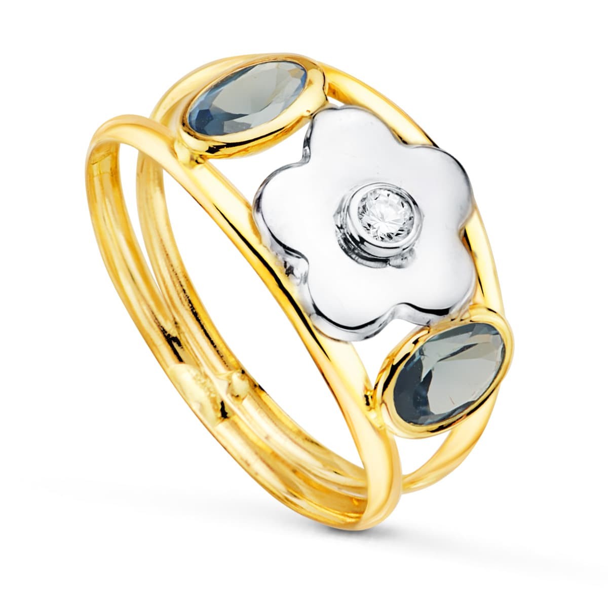 18K SORTIJA ORO BICOLOR FLOR CON CIRCONITA Y CIRCONITA AGUAMARINA OVALES ANCHO: 9 MM