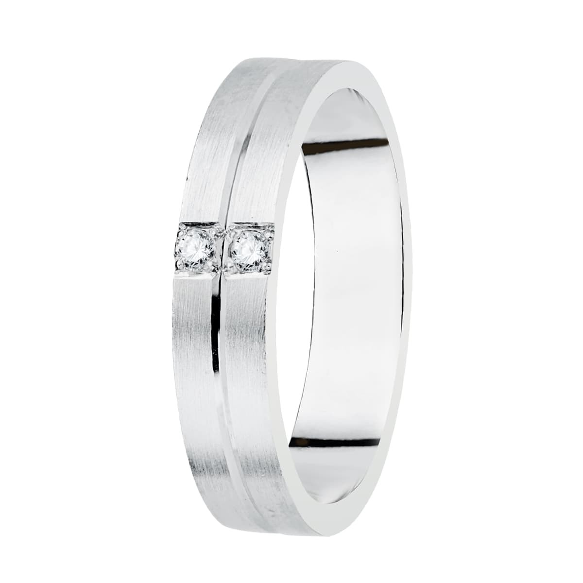 18K ALIANZA ORO BLANCO MATIZADA 2 DIAMANTES 0.06 QTS. ANCHO: 4MM....