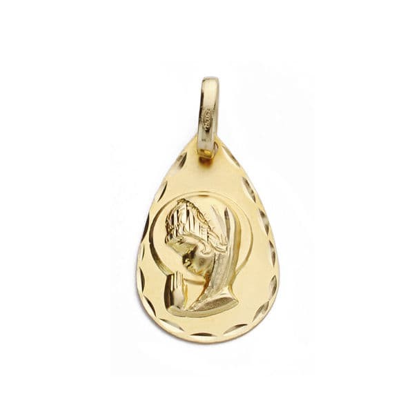 18K MEDALLA ORO AMARILLO VIRGEN NIÑA LAGRIMA TALLADA 19 X 11 MM.