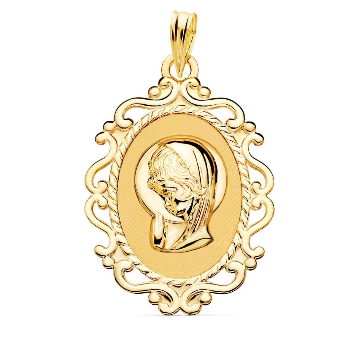 18K MEDALLA VIRGEN NIÑA CERCO CALADO EN BRILLO 31X21 MM