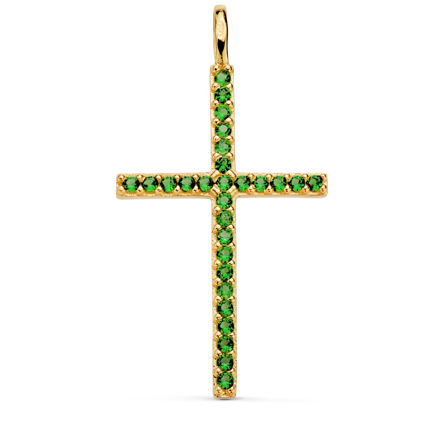 18K CRUZ ORO AMARILLO CON CIRCONITAS VERDES 37 X 19 MM. ANILLA FIJA