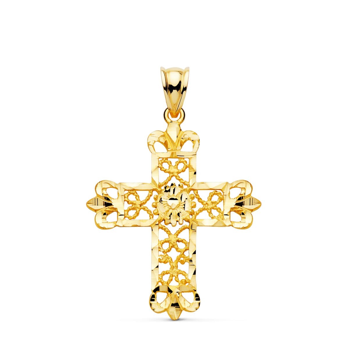 18K CRUZ ORO AMARILLO FILIGRANA BORDES TALLADOS. 35 X 29 MM