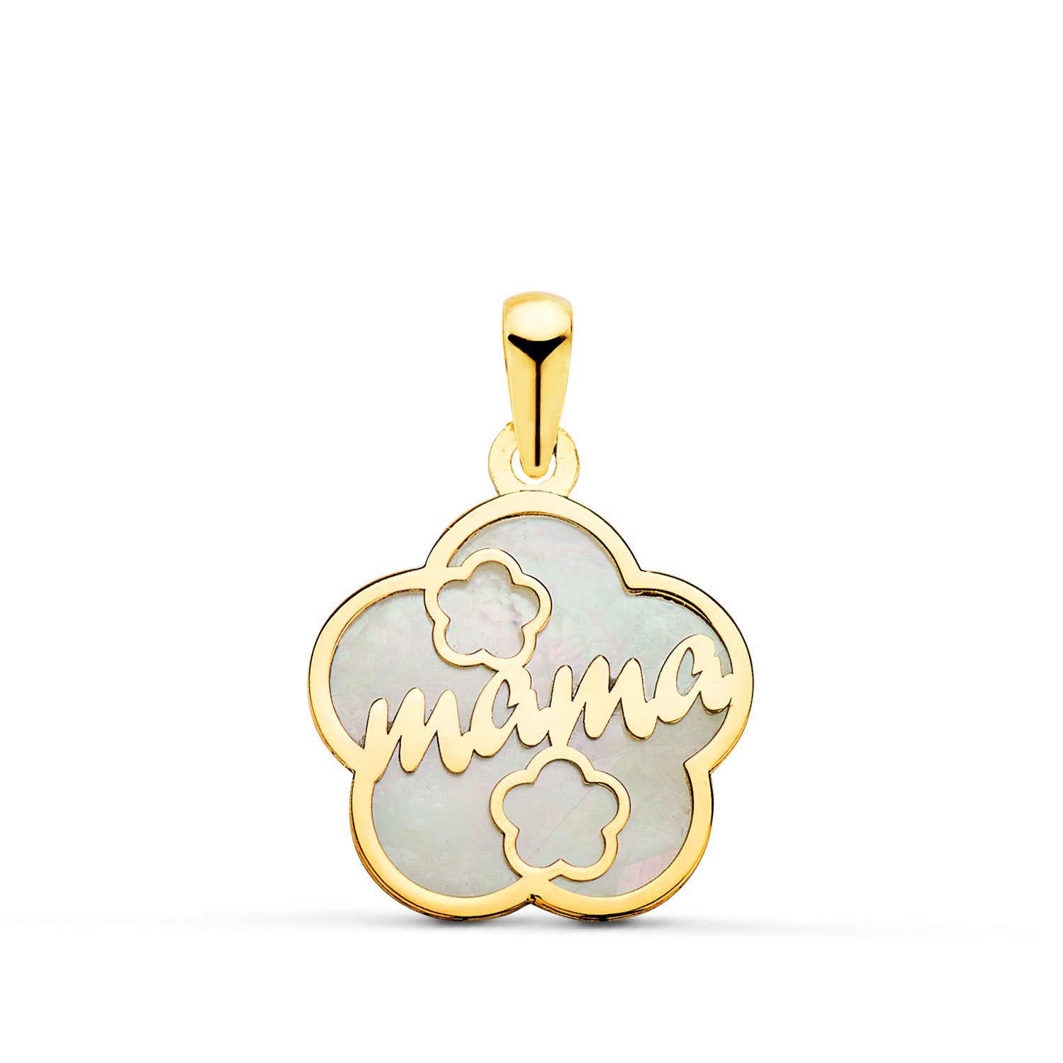 18K COLGANTE DE NACAR FORMA DE FLOR Y MAMA CON CORAZONES 15X15MM