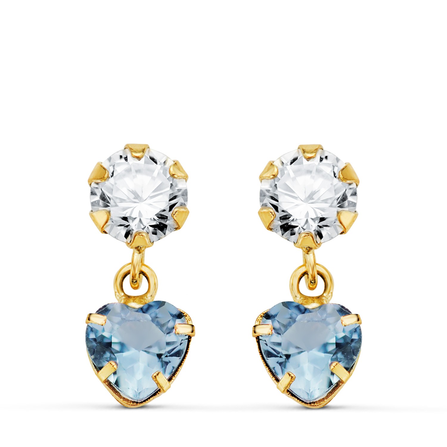 18K PENDIENTES ORO AMARILLO DOS CUERPOS CON CIRCONITA Y AGUAMARINA CORAZON 14 X 5MM. CIERRE PRESION
