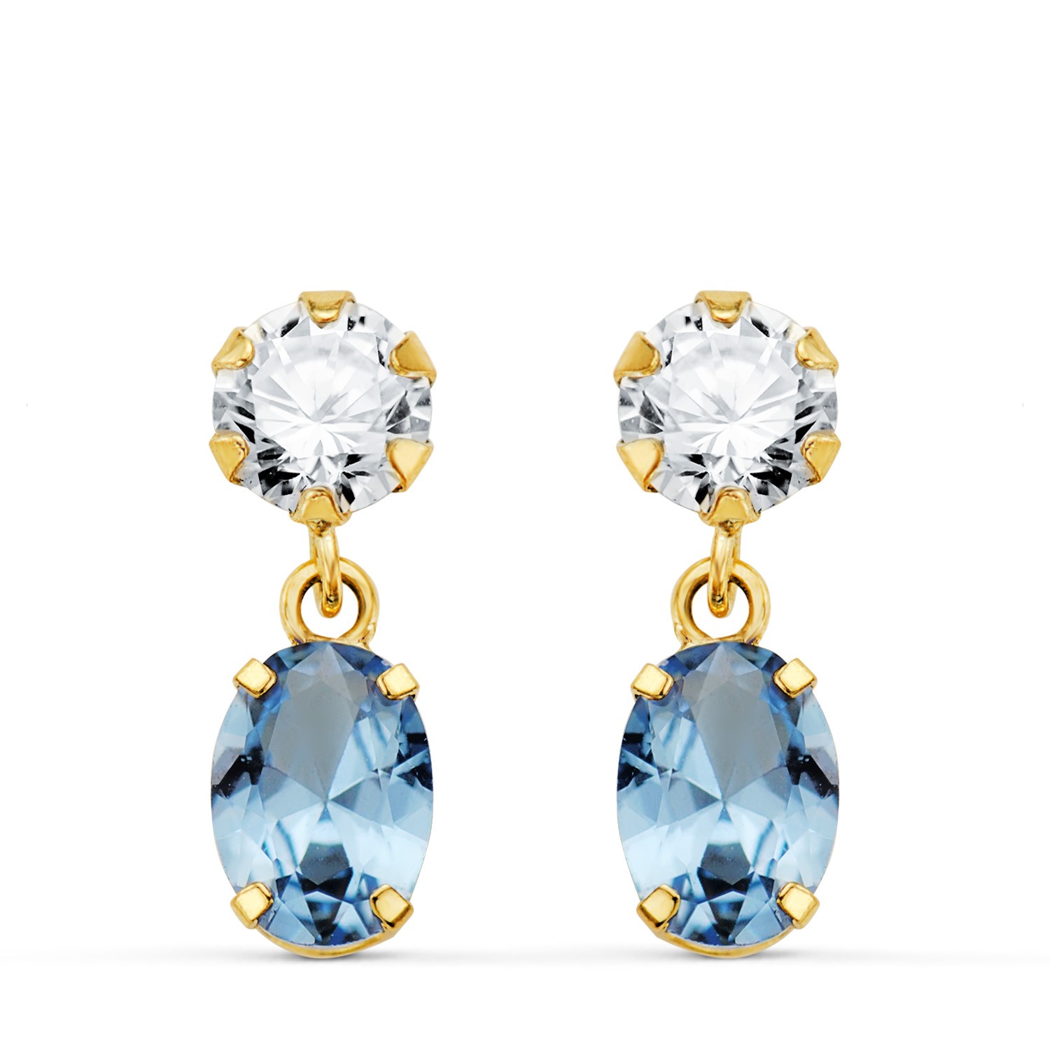18K PENDIENTES ORO AMARILLO DOS CUERPOS CON CIRCONITA Y AGUAMARINA OVAL 16 X 5MM. CIERRE PRESION