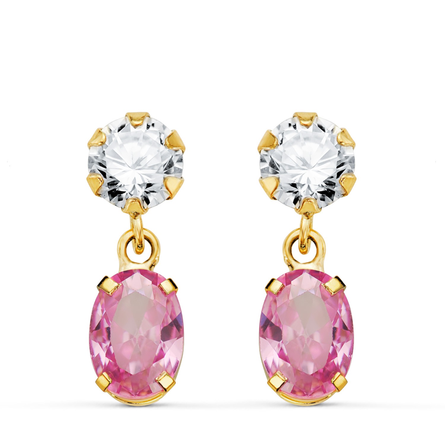 18K PENDIENTES ORO AMARILLO DOS CUERPOS CON CIRCONITA Y PIEDRA ROSA OVAL 16 X 5MM. CIERRE PRESION