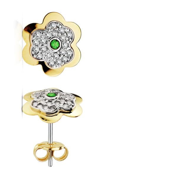 18K PENDIENTES ORO AMARILLO FLOR 6 HOJAS ESMERALDA CIRCONITAS 6 MM