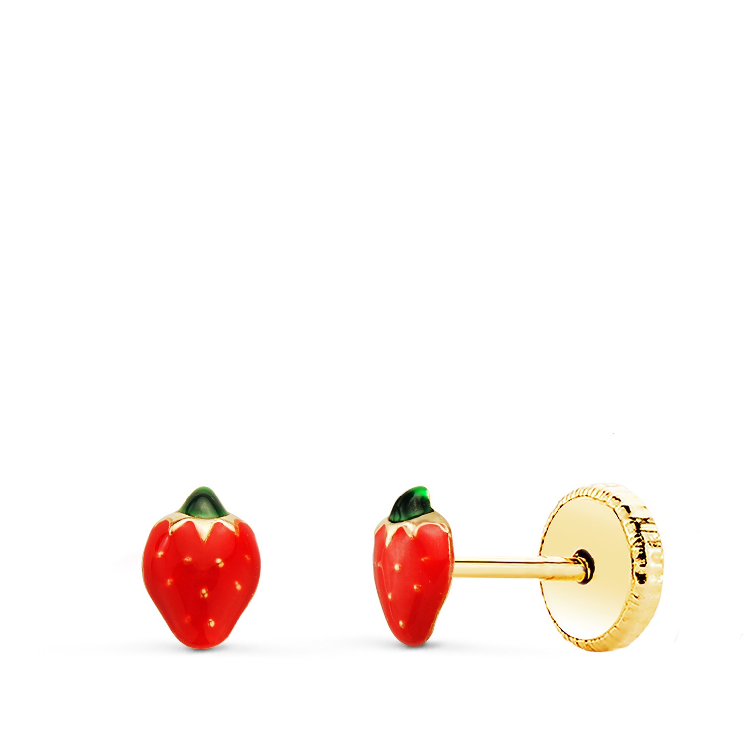 18K PENDIENTES ORO AMARILLO FRESAS MINIS ESMALTE 5,5X4 MM. CIERRE TUERCA
