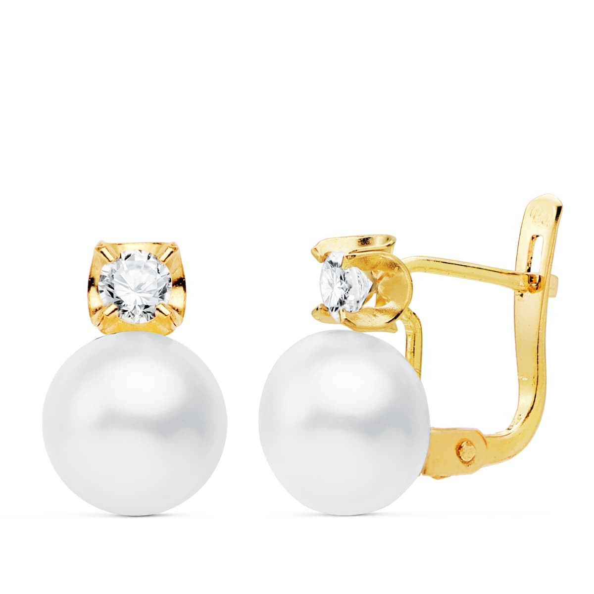 18K PENDIENTES ORO AMARILLO GARRAS CIRCONITA PERLA 7.5 MM 11X7.5 MM CIERRE CATALAN