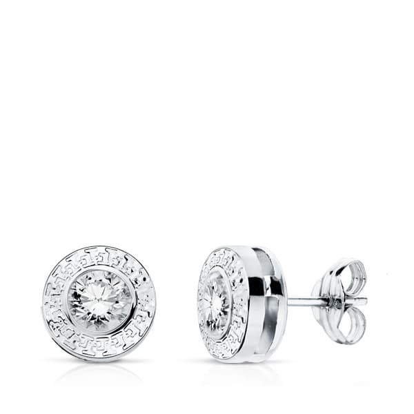 18K PENDIENTES ORO BLANCO REDONDOS 7 MM CON GRECA Y CIRCONITA CIERRE PRESION