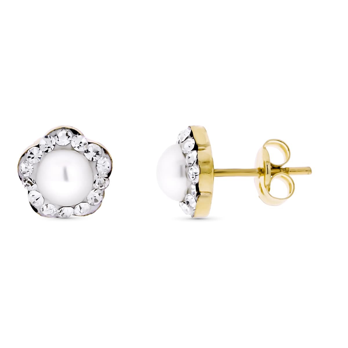 9K PENDIENTES ORO AMARILLO FLOR CON CIRCONITAS Y PERLA 5 MM. MEDIDA: 7X7 MM. CIERRE PRESION