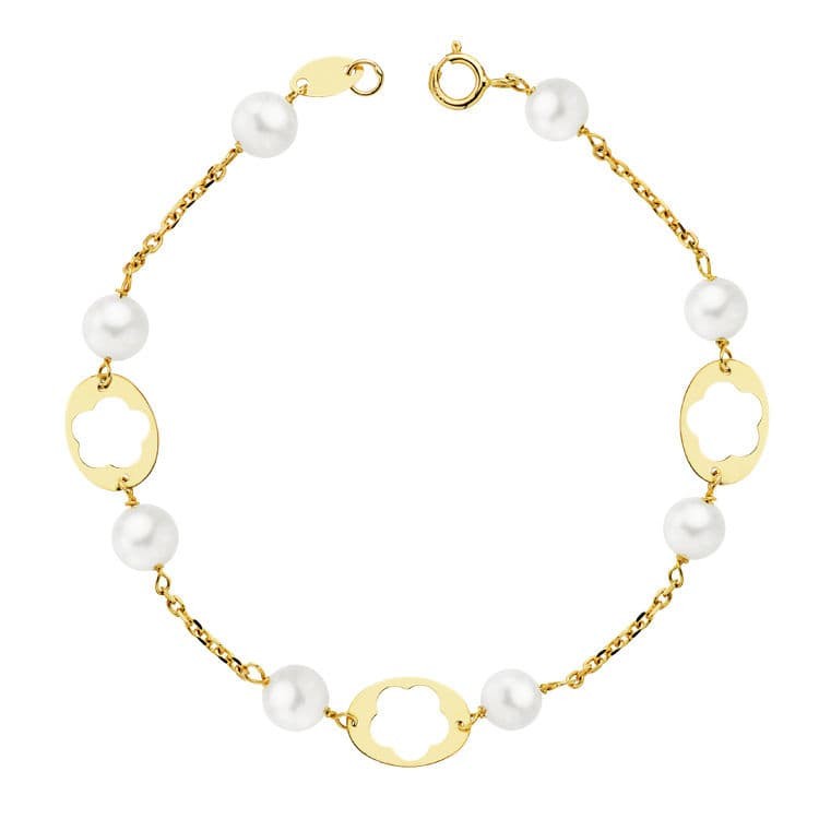 PULSERA 9 KTES PERLAS Y MOTIVOS. 17 CM.