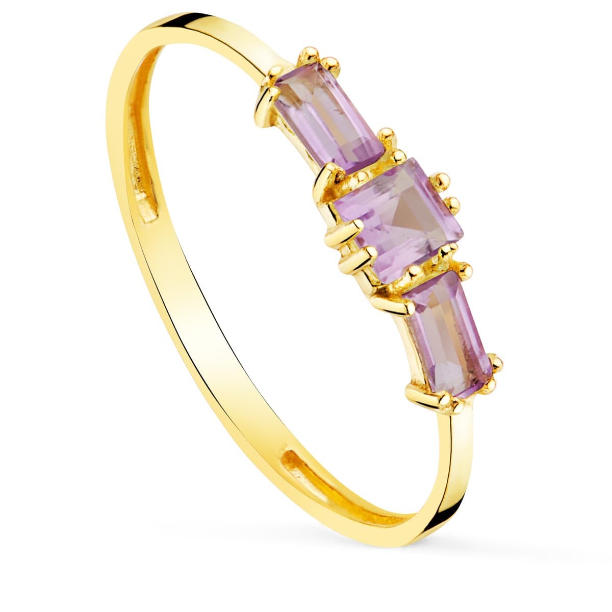 18K SORTIJA ORO AMARILLO 3 PIEDRAS AMATISTAS NATURALES 3X3 MM 4X2 MM