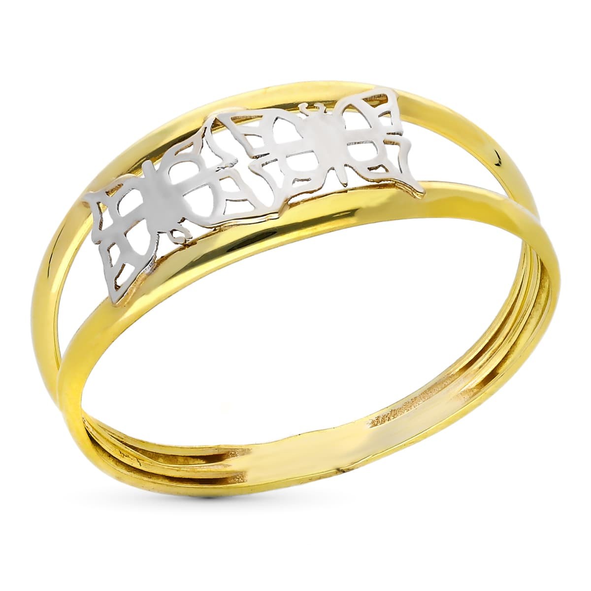 9K SORTIJA ORO BICOLOR DOBLE CUERPO CON DOS MARIPOSAS CALADAS. ANCHO: 8 MM